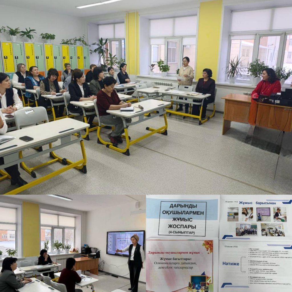 05.01.2026ж. күні бастауыш сыныптар бойынша әдістемелік отырыс өтті. Отырыс барысында мына мәселелер қаралды: Мұғалімнің кәсіби психологиялық интеллектісін дамыту курсы жобасымен таныстыру; Білім беру үдерісінде заманауи технологияларды пайдалану; Дарынды және үлгерімі төмен оқушылармен жүргізілетін жұмыстардың жартыжылдық есебі.